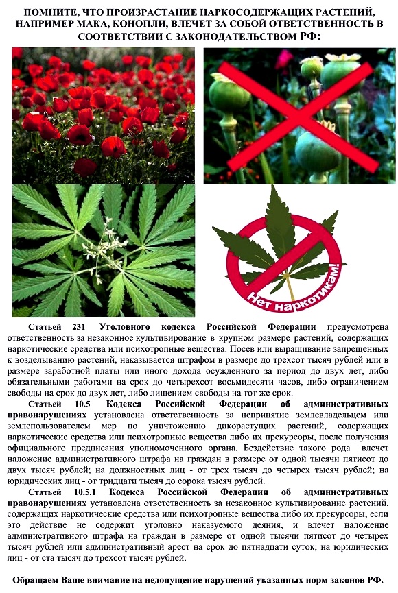 ПОМНИТЕ, ЧТО ПРОИЗРАСТАНИЕ НАРКОСОДЕРЖАЩИХ РАСТЕНИЙ, НАПРИМЕР МАКА, КОНОПЛИ, ВЛЕЧЕТ ЗА СОБОЙ ОТВЕТСТВЕННОСТЬ В СООТВЕТСТВИИ С ЗАКОНОДАТЕЛЬСТВОМ РФ: